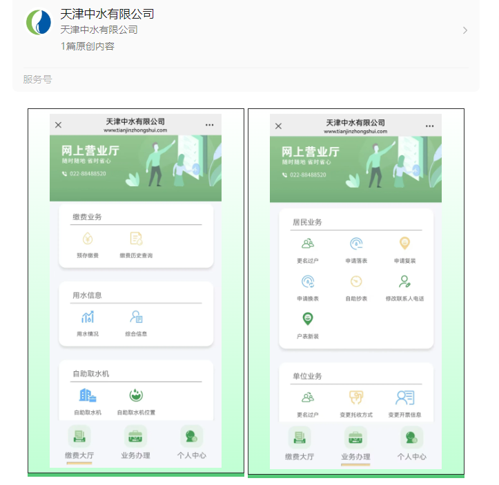 再生水網(wǎng)上營(yíng)業(yè)廳依托“天津中水有限公司微信公眾號(hào)”平臺(tái),“繳費(fèi)大廳、業(yè)務(wù)辦理、個(gè)人中心”三大板塊,從用戶角度出發(fā),充分考慮體驗(yàn)感、服務(wù)性及透明度,為用戶提供更加便捷、高效的服務(wù)新體驗(yàn):居民用戶和單位用戶可通過(guò)繳費(fèi)大廳功能隨時(shí)隨地查詢水費(fèi)賬單,通過(guò)多種支付方式進(jìn)行在線繳納,無(wú)需到線下?tīng)I(yíng)業(yè)廳繳費(fèi);業(yè)務(wù)辦理提供報(bào)裝申請(qǐng)、更名過(guò)戶、信息變更、水表更換、落表及復(fù)裝等多種自助功能,只需在線提交相關(guān)信息和照片,即可完成業(yè)務(wù)辦理,極大節(jié)省了用戶時(shí)間和精力;通過(guò)個(gè)人中心實(shí)時(shí)更新的數(shù)據(jù),用戶可以查詢用水歷史記錄、用水曲線圖等信息,更合理地規(guī)劃用水。網(wǎng)上營(yíng)業(yè)廳打破了傳統(tǒng)營(yíng)業(yè)廳時(shí)間和空間的限制,以數(shù)字化賦能自助化,助力用戶滿意度和信任感的提升。