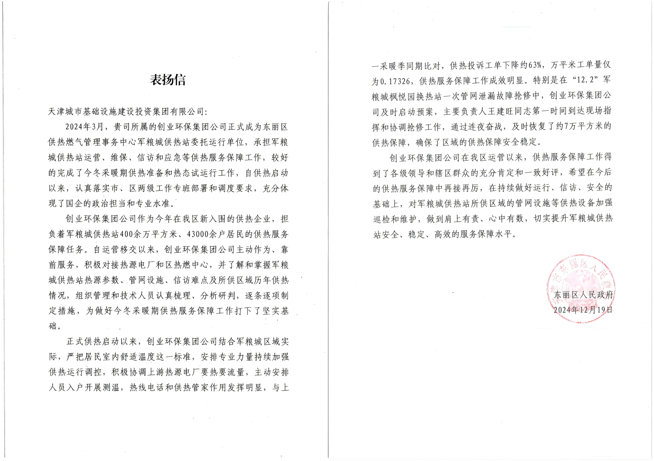 近日,城投集團(tuán)收到了一封來(lái)自東麗區(qū)人民的表?yè)P(yáng)信,對(duì)創(chuàng)業(yè)環(huán)保集團(tuán)天創(chuàng)綠能公司自供熱啟動(dòng)以來(lái)全力保障供熱質(zhì)量,展現(xiàn)國(guó)企政治擔(dān)當(dāng)?shù)南嚓P(guān)工作表示肯定。